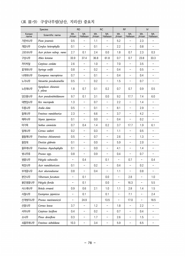 78 Species RD RC RF IV Korean name Scientific name Mt. Jirisan Mt. Hallasan Mt. Jirisan Mt. Hallasan Mt. Jirisan Mt. Hallasan Mt. Jirisan Mt. Hallasan 가문비나무 Picea jezoensis 0.5 1.1 5.2 2.3 개암나무 Corylus heterophylla 0.1 0.1 2.2 0.8 고로쇠나무 Acer pictum subsp. mono 2.7 0.1 2.4 0.0 1.8 0.7 2.3 0.3 구상나무 Abies koreana 33.9 37.4 36.8 61.8 0.7 0.7 23.8 33.3 까치박달 Carpinus cordata 2.6 1.0 7.0 3.5 꽃개회나무 Syring...