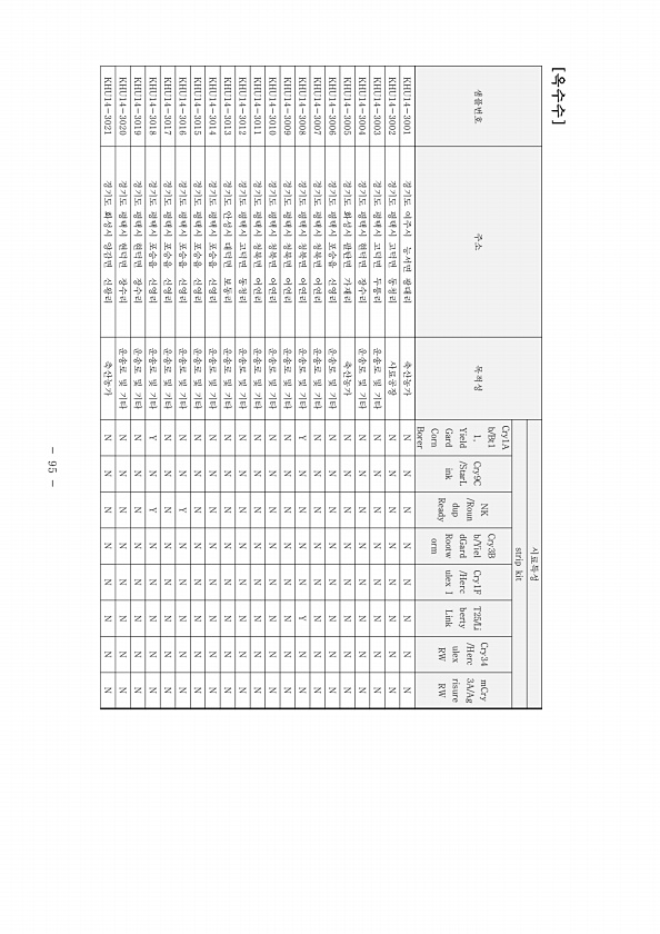 95 샘플번호 주소 목적성 시료특성 strip kit Cry1A b/Bt1 1, Yield Gard Corn Borer Cry9C /StarL ink NK /Roun dup Ready Cry3B b/Yiel dGard Rootw orm Cry1F /Herc ulex I T25/Li berty Link Cry34 /Herc ulex RW mCry 3A/Ag risure RW KHU14-3001 경기도 여주시 능서면 광대리 축산농가 N N N N N N N N KHU14-3002 경기도 평택시 고덕면 동청리 사료공장 N N N N N N N N KHU14-3003 경기도 평택시 고덕면 두릉리 운송로 및 기타 N N N N N N N N KHU14-3004 경기도 평택시 현덕면 장수리 운송로 및 기타 N N N ...