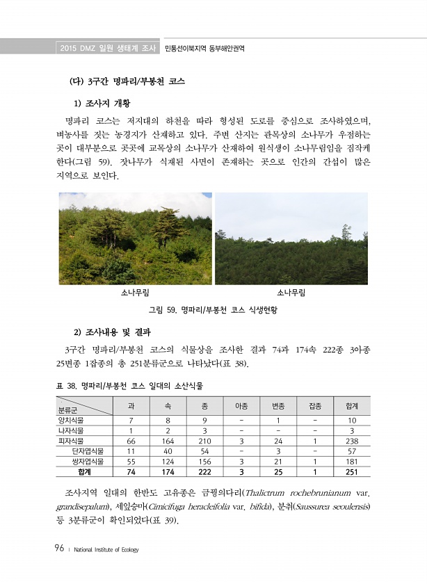 2015 DMZ 일원 생태계 조사 민통선이북지역 동부해안권역 96 ? National Institute of Ecology 다 3구간 명파리/부봉천 코스 1 조사지 개황 명파리 코스는 저지대의 하천을 따라 형성된 도로를 중심으로 조사하였으며, 벼농사를 짓는 농경지가 산재하고 있다. 주변 산지는 관목상의 소나무가 우점하는 곳이 대부분으로 곳곳에 교목상의 소나무가 산재하여 원식생이 소나무림임을 짐작케 한다 그림 59 잣나무가 식재된 사면이 존재하는 곳으로 인간의 간섭이 많은 지역으로 보인다. 소나무림 소나무림 그림 59. 명파리/부봉천 코스 식생현황 2 조사내용 및 결과 3구간 명파리/부봉천 코스의 식물상을 조사한 결과 74과 174속 222종 3아종 25변종 1잡종의 총 251분류군으로 나타났다 표 38 분류...