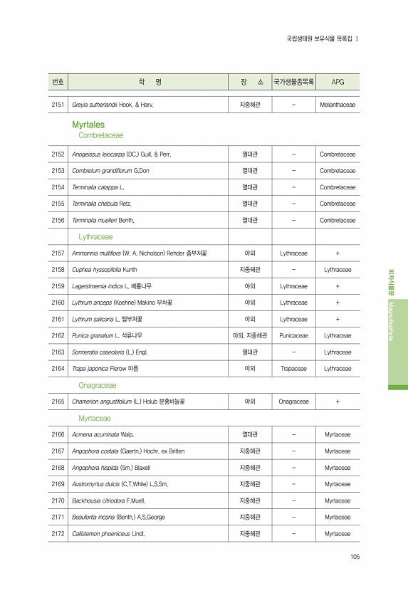 105 번호 학 명 장 소 국가생물종목록 APG 피자식물문 Magnoliophyta 국립생태원 보유식물 목록집 Ⅰ 2151 Greyia sutherlandii Hook. & Harv. 지중해관 Melianthaceae Myrtales Combretaceae 2152 Anogeissus leiocarpa DC. Guill. & Perr. 열대관 Combretaceae 2153 Combretum grandiflorum G.Don 열대관 Combretaceae 2154 Terminalia catappa L. 열대관 Combretaceae 2155 Terminalia chebula Retz. 열대관 Combretaceae 2156 Terminalia muelleri Benth. 열대관 Combretaceae Lyt...