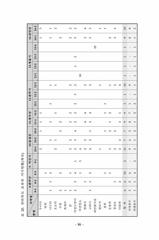 표 20. 전라북도 포유류 서식현황 계속 지역명 종명 8.완주군 9. 익산시 10.임실군 11.장수군 12.전주시 13.정읍시 14.진안군 8-1 8-2 8-3 9-1 10-1 10-2 10-3 11-1 11-2 12-1 12-2 12-3 13-1 13-2 13-3 13-4 14-1 14-2 두더지 2 1 1 1 1 3 땃쥐 1 너구리 1 1 2 1 1 1 1 1 1 오소리 2 1 1 1 2 수달 2 2 2 2 2 족제비 1 삵 1 1 2 2 2 2 2 2 2 야생고양이 2 5 4 1 2 3 4 2 2 2 3 2 1 2 5 2 야생염소 1 3 4 18 멧돼지 1 2 2 4 4 2 2 4 고라니 1 1 2 4 2 1 2 4 2 3 3 대만꽃사슴 22 멧토끼 1 1 1 집쥐 1 1 1 1 1 등줄쥐 1 3 2 ...