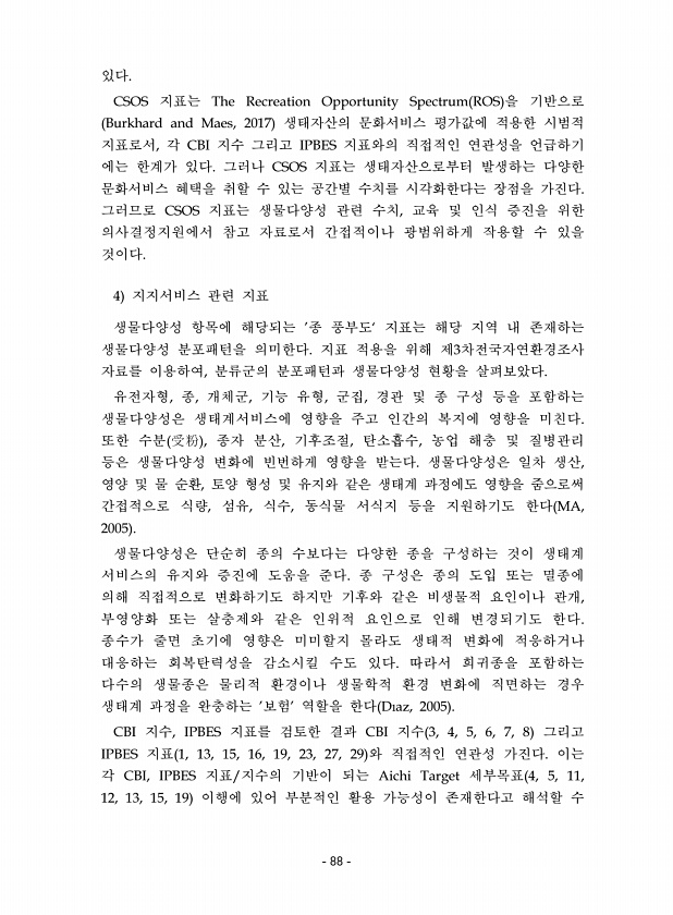 있다. CSOS 지표는 The Recreation Opportunity Spectrum ROS 을 기반으로 Burkhard and Maes, 2017 생태자산의 문화서비스 평가값에 적용한 시범적 지표로서, 각 CBI 지수 그리고 IPBES 지표와의 직접적인 연관성을 언급하기 에는 한계가 있다. 그러나 CSOS 지표는 생태자산으로부터 발생하는 다양한 문화서비스 혜택을 취할 수 있는 공간별 수치를 시각화한다는 장점을 가진다. 그러므로 CSOS 지표는 생물다양성 관련 수치, 교육 및 인식 증진을 위한 의사결정지원에서 참고 자료로서 간접적이나 광범위하게 작용할 수 있을 것이다. 4 지지서비스 관련 지표 생물다양성 항목에 해당되는 ’종 풍부도‘ 지표는 해당 지역 내 존재하는 생물다양성 분포패턴을 의미한다. 지표 적용...