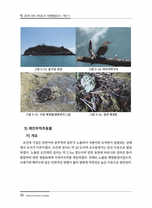 2018 전국 무인도서 자연환경조사 여수 1 96 ? National Institute of Ecology 5 조간대 기질은 암반이며 중부역의 일부가 노출되어 지충이와 모자반이 관찰되는 상태 에서 조사가 이루어졌다. 조간대 경사는 약 20 도이며 조수웅덩이는 중간 수준으로 발달 하였다. 노출된 조간대의 길이는 약 2.5m 정도이며 암반 표면에 타포니와 갈라진 틈이 발달하여 암반 생물들에게 미세서식처를 제공하였다. 외해로 노출된 해양환경이었으며, 쓰레기와 폐어구와 같은 인위적인 영향이 없어 생태계 자연성은 높은 수준으로 판단된다. 그림 5-13. 솔거섬 전경 그림 5-14. 바다직박구리 그림 5-15. 수달 배설물 멸종위기Ⅰ급 그림 5-16. 집쥐배설물