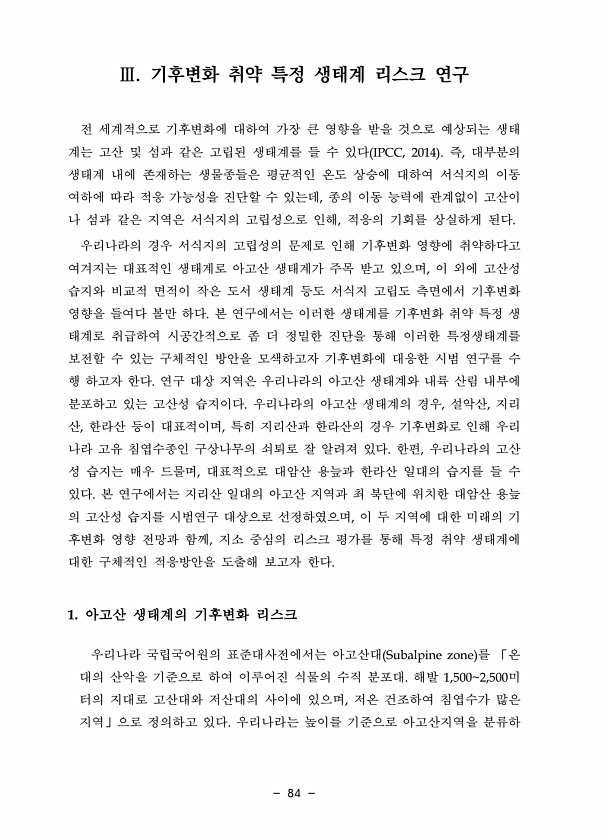 84 Ⅲ. 기후변화 취약 특정 생태계 리스크 연구 전 세계적으로 기후변화에 대하여 가장 큰 영향을 받을 것으로 예상되는 생태 계는 고산 및 섬과 같은 고립된 생태계를 들 수 있다 IPCC, 2014 즉, 대부분의 생태계 내에 존재하는 생물종들은 평균적인 온도 상승에 대하여 서식지의 이동 여하에 따라 적응 가능성을 진단할 수 있는데, 종의 이동 능력에 관계없이 고산이 나 섬과 같은 지역은 서식지의 고립성으로 인해, 적응의 기회를 상실하게 된다. 우리나라의 경우 서식지의 고립성의 문제로 인해 기후변화 영향에 취약하다고 여겨지는 대표적인 생태계로 아고산 생태계가 주목 받고 있으며, 이 외에 고산성 습지와 비교적 면적이 작은 도서 생태계 등도 서식지 고립도 측면에서 기후변화 영향을 들여다 볼만 하다. 본 연구에서는...
