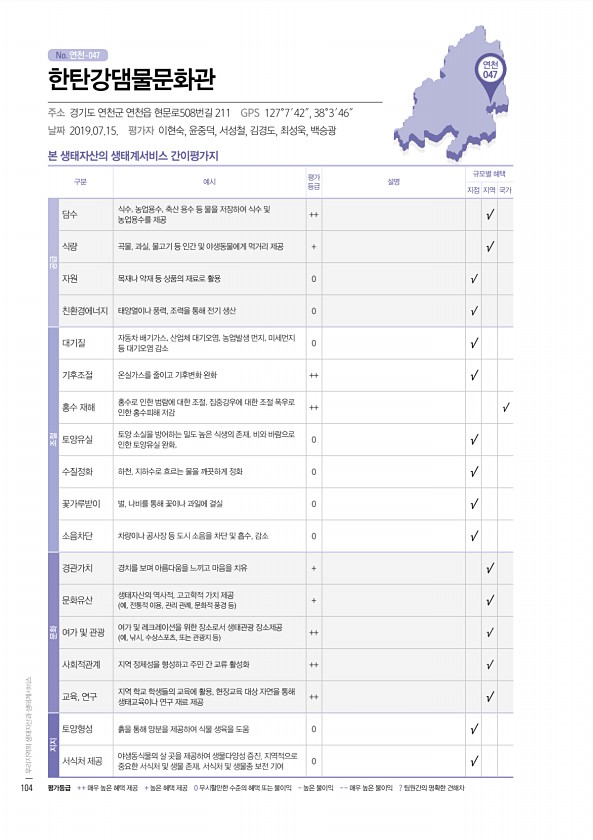 No. 연천- 연천 047 본 생태자산의 생태계서비스 간이평가지 구분 예시 평가 등급 설명 규모별 혜택 지점 지역 국가 공급 담수 식수, 농업용수, 축산 용수 등 물을 저장하여 식수 및 농업용수를 제공 ++ √ 식량 곡물, 과실, 물고기 등 인간 및 야생동물에게 먹거리 제공 + √ 자원 목재나 약재 등 상품의 재료로 활용 0 √ 친환경에너지 태양열이나 풍력, 조력을 통해 전기 생산 0 √ 조절 대기질 자동차 배기가스, 산업체 대기오염, 농업발생 먼지, 미세먼지 등 대기오염 감소 0 √ 기후조절 온실가스를 줄이고 기후변화 완화 ++ √ 홍수 재해 홍수로 인한 범람에 대한 조절, 집중강우에 대한 조절 폭우로 인한 홍수피해 저감 ++ √ 토양유실 토양 소실을 방어하는 밀도 높은 식생의 존재, 비와 바람으로 인한 ...