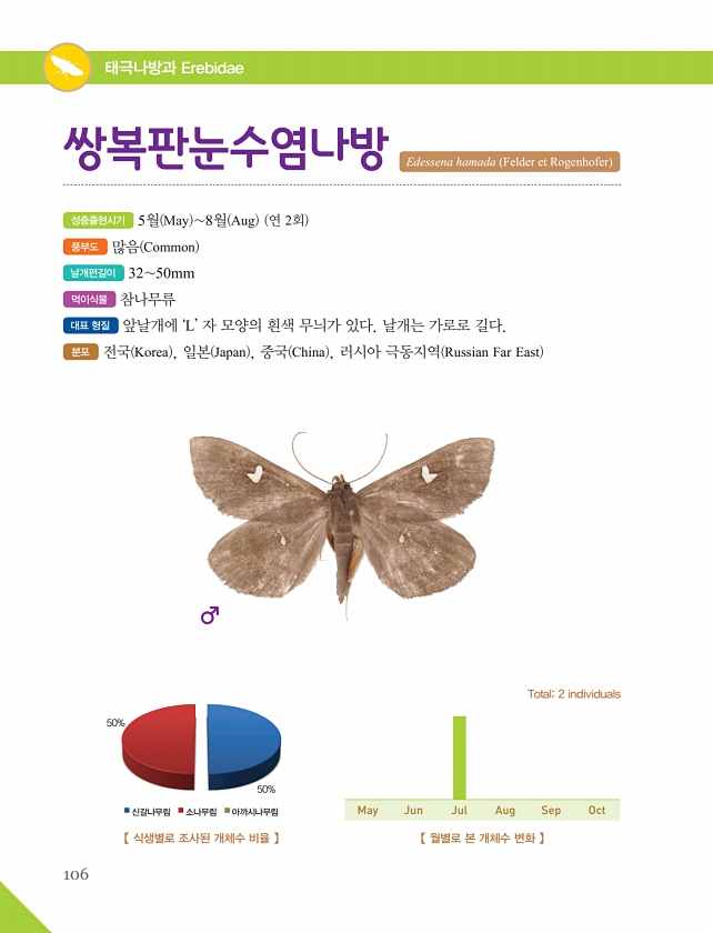 106 태극나방과 Erebidae 성충출현시기 5월 May 8월 Aug 연 2회 풍부도 많음 Common 날개편길이 3250mm 먹이식물 참나무류 대표 형질 앞날개에 ‘L’ 자 모양의 흰색 무늬가 있다. 날개는 가로로 길다. 분포 전국 Korea , 일본 Japan , 중국 China , 러시아 극동지역 Russian Far East 쌍복판눈수염나방 Edessena hamada Felder et Rogenhofer 【 식생별로 조사된 개체수 비율 】 50% 신갈나무림 소나무림 아까시나무림 50% 【 월별로 본 개체수 변화 】 Total2 individuals May Jun Jul Aug SepOct
