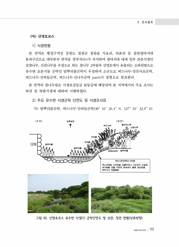 Ⅱ. 조사결과 www.nie.re.kr ? 95 마 산명호코스 1 식생현황 본 권역은 행정구역상 강원도 철원군 철원읍 사요리, 외촌리 등 철원평야지대 통과구간으로 대부분의 면적을 경작지 논 가 차지하며 평야지대 내에 일부 잔존식생인 갈참나무, 신갈나무를 우점으로 하는 참나무 2차림과 산명호에서 유출되는 소하천변으로 유수변 초본식물 군락인 달뿌리풀군락이 우점하며 소규모로 버드나무-삿갓사초군락, 버드나무-선버들군락, 버드나무-신나무군락 patch가 점형으로 분포한다. 본 권역의 참나무림은 식생보전등급 Ⅲ등급에 해당되며 본 지역에서의 주요 조사는 하천 및 하변식생에 대하여 시행하였다. 2 주요 유수변 식생군락 단면도 및 식생조사표 가 달뿌리풀군락, 버드나무-선버들군락 38°16′26.4″N. 127°10′32.9...