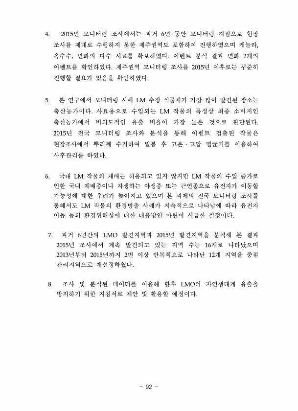 4. 2015년 모니터링 조사에서는 과거 6년 동안 모니터링 지점으로 현장 조사를 제대로 수행하지 못한 제주권역도 포함하여 진행하였으며 캐놀라, 옥수수, 면화의 다수 시료를 확보하였다. 이벤트 분석 결과 면화 2개의 이벤트를 확인하였다. 제주권역 모니터링 조사를 2015년 이후로는 꾸준히 진행할 필요가 있음을 확인하였다. 5. 본 연구에서 모니터링 시에 LM 추정 식물체가 가장 많이 발견된 장소는 축산농가이다. 사료용으로 수입되는 LM 작물의 특성상 최종 소비지인 축산농가에서 비의도적인 유출 비율이 가장 높은 것으로 판단된다. 2015년 전국 모니터링 조사와 분석을 통해 이벤트 검출된 작물은 현장조사에서 뿌리째 수거하여 밀봉 후 고온?고압 멸균기를 이용하여 사후관리를 하였다. 6. 국내 LM 작물의 재배는 ...