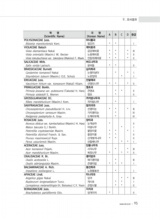 Ⅱ. 조사결과 www.nie.re.kr ? 95 학 명 Scientific Name 국 명 Korean Name A B C D 등급 POLYGONACEAE Juss. 마디풀과 Bistorta manshuriensis Kom. 범꼬리 * * Ⅰ VIOLACEAE Batsch 제비꽃과 Viola diamantiaca Nakai 금강제비꽃 * * * Ⅲ Viola orientalis Maxim. W. Becker 노랑제비꽃 * * * Ⅱ Viola tokubuchiana var. takedana Makino F. Maek. 민둥뫼제비꽃 * * * Ⅱ SALICACEAE Mirb. 버드나무과 Salix rorida Lacksch. 분버들 * * Ⅱ BRASSICACEAE Burnett 십자화과 Cardamine k...
