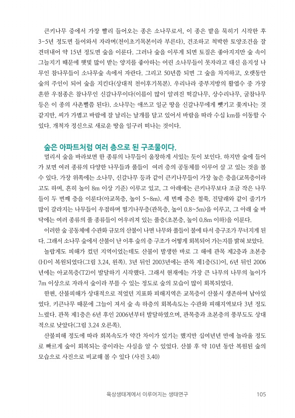 육상생태계에서 이루어지는 생태연구 105 큰키나무 중에서 가장 빨리 들어오는 종은 소나무로서, 이 종은 밭을 묵히기 시작한 후 3-5년 정도면 들어와서 자라며 천이초기목본이라 부른다 , 건조하고 척박한 토양조건을 잘 견뎌내어 약 15년 정도면 숲을 이룬다. 그러나 숲을 이루게 되면 토질은 좋아지지만 숲 속이 그늘지기 때문에 햇빛 많이 받는 양지를 좋아하는 어린 소나무들이 못자라고 대신 음지성 나 무인 참나무들이 소나무숲 속에서 자란다. 그리고 50년쯤 되면 그 숲을 차지하고, 오랫동안 숲의 주인이 되어 숲을 지킨다 상대적 천이후기목본 우리나라 중부지방의 활엽수 중 가장 흔한 우점종은 참나무인 신갈나무이다 이름이 많이 알려진 떡갈나무, 상수리나무, 굴참나무 등은 이 종의 사촌뻘쯤 된다 소나무는 애쓰고 일군 땅...