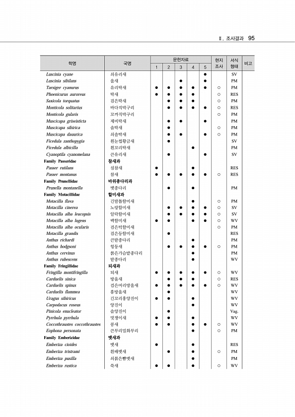 Ⅱ. 조사결과 95 학명 국명 문헌자료 현지 조사 서식 1 2 3 4 5 형태 비고 Luscinia cyane 쇠유리새 ● SV Luscinia sibilans 울새 ● ● PM Tarsiger cyanurus 유리딱새 ● ● ● ● ● ○ PM Phoenicurus auroreus 딱새 ● ● ● ● ○ RES Saxicola torquatus 검은딱새 ● ● ● ○ PM Monticola solitarius 바다직박구리 ● ● ● ● ○ RES Monticola gularis 꼬까직박구리 ○ PM Muscicapa griseisticta 제비딱새 ● ● ● PM Muscicapa sibirica 솔딱새 ● ○ PM Muscicapa dauurica 쇠솔딱새 ● ● ● ○ PM Ficedula zantho...