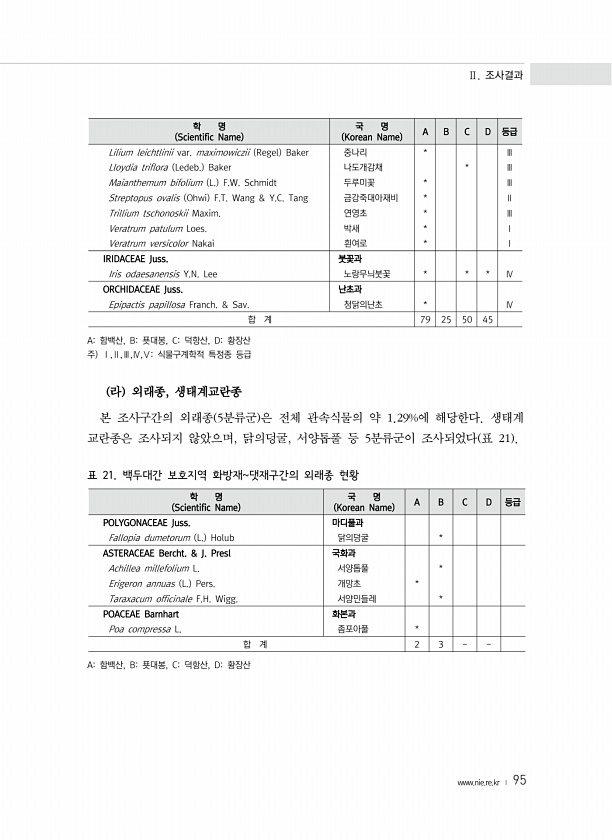 Ⅱ. 조사결과 www.nie.re.kr ? 95 학 명 Scientific Name 국 명 Korean Name A B C D 등급 Lilium leichtlinii var. maximowiczii Regel Baker 중나리 * Ⅲ Lloydia triflora Ledeb. Baker 나도개감채 * Ⅲ Maianthemum bifolium L. F.W. Schmidt 두루미꽃 * Ⅲ Streptopus ovalis Ohwi F.T. Wang & Y.C. Tang 금강죽대아재비 * Ⅱ Trillium tschonoskii Maxim. 연영초 * Ⅲ Veratrum patulum Loes. 박새 * Ⅰ Veratrum versicolor Nakai 흰여로 * Ⅰ IRIDACEAE Juss. 붓꽃과 Iris o...