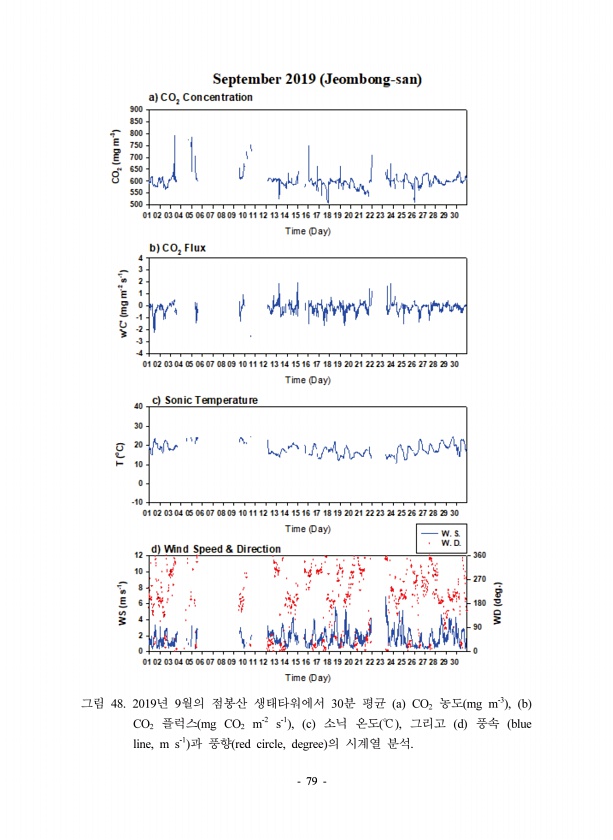 79 48. 2019 9 30 a CO2 mg m-3 , b CO2 mg CO2 m-2 s-1 , c , d blue line, m s-1 red circle, degree