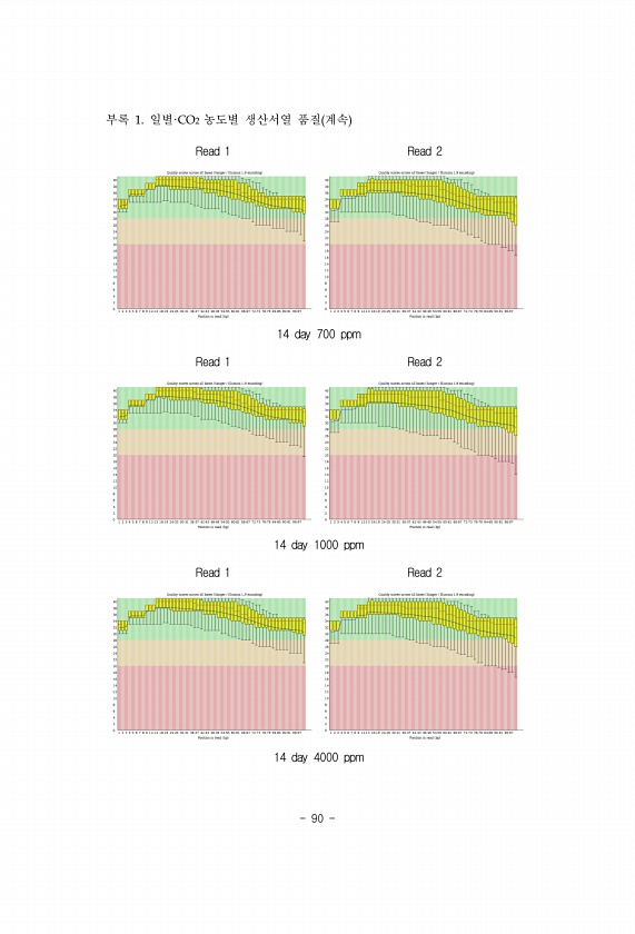 90 부록 1. 일별·CO2 농도별 생산서열 품질 계속 Read 1 Read 2 14 day 700 ppm Read 1 Read 2 14 day 1000 ppm Read 1 Read 2 14 day 4000ppm