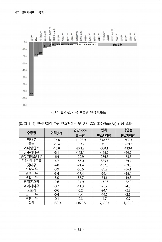 국가 생태계서비스 평가 88 그림 Ⅲ-1-28 각 수종별 면적변화 ha 수종명 면적 ha 연간 CO2 흡수량 입목 탄소저장량 낙엽층 탄소저장량 밤나무 -76.6 -1,122.9 -3,843.3 -507.7 곰솔 -20.4 -137.7 -931.9 -229.3 기타활엽수 -18.0 -241.7 -860.1 -119.4 상수리나무 -8.1 -112.1 -448.8 -40.8 중부지방소나무 -6.4 -20.9 -276.8 -75.8 기타 참나무류 -4.7 -58.0 -325.7 -29.4 잣나무 -4.0 -21.4 -137.3 -29.6 자작나무 -3.9 -56.6 -99.7 -26.1 편백나무 -3.4 -17.4 -84.4 -38.4 백합나무 -3.0 -37.7 -51.6 -19.8 침활혼효림 -2.6 -24....