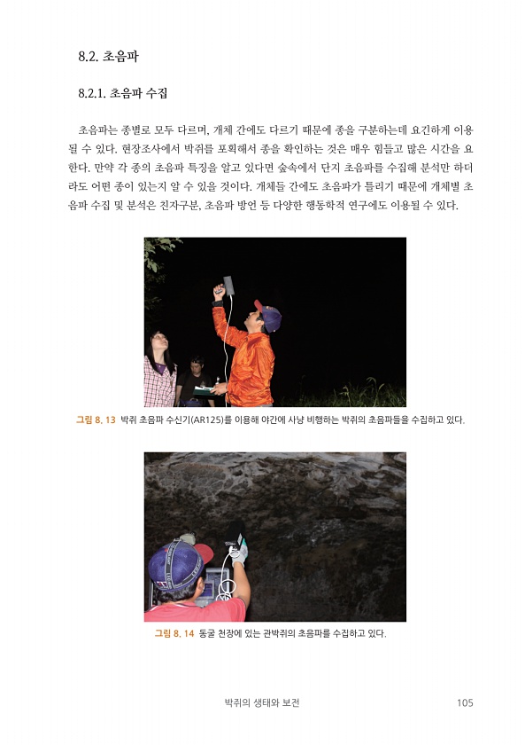 박쥐의 생태와 보전 105 그림 8. 13 박쥐 초음파 수신기 AR125 를 이용해 야간에 사냥 비행하는 박쥐의 초음파들을 수집하고 있다. 그림 8. 14 동굴 천장에 있는 관박쥐의 초음파를 수집하고 있다. 8.2. 초음파 8.2.1. 초음파 수집 초음파는 종별로 모두 다르며, 개체 간에도 다르기 때문에 종을 구분하는데 요긴하게 이용 될 수 있다. 현장조사에서 박쥐를 포획해서 종을 확인하는 것은 매우 힘들고 많은 시간을 요 한다. 만약 각 종의 초음파 특징을 알고 있다면 숲속에서 단지 초음파를 수집해 분석만 하더 라도 어떤 종이 있는지 알 수 있을 것이다. 개체들 간에도 초음파가 틀리기 때문에 개체별 초 음파 수집 및 분석은 친자구분, 초음파 방언 등 다양한 행동학적 연구에도 이용될 수있다.