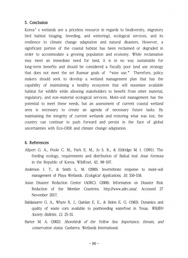 90 5. Conclusion Korea’s wetlands are a priceless resource in regards to biodiversity, migratory bird habitat staging, breeding, and wintering , ecological services, and its resilience to climate change adaptation and natural disasters. However, a significant portion of the coastal habitat has been reclaimed or degraded in order to accommodate a growing population and economy. While reclamation ma...