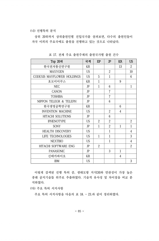 85 나 선행특허 분석 상위 20위까지 상위출원인별 진입국가를 살펴보면, 다수의 출원인들이 자국 이외의 주요국에도 출원을 진행하고 있는 것으로 나타났다. Top 20위 국적 EP JP KR US 한국전자통신연구원 KR 13 2 MAXYGEN US 2 10 CODEXIS MAYFLOWER HOLDINGS US 5 1 6 호모미미쿠스 KR 1 9 NEC JP 1 6 1 CANON JP 7 TOSHIBA JP 7 NIPPON TELEGR & TELEPH JP 6 한국생명공학연구원 KR 6 INVENTION MACHINE US 2 4 HITACHI SOLUTIONS JP 6 IPHENOTYPE US 2 2 2 SONY JP 1 2 1 1 HEALTH DISCOVERY US 1 4 LIFE TECHNOLOGIES U...