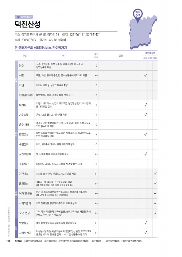No. 파주- 파주 047 본 생태자산의 생태계서비스 간이평가지 구분 예시 평가 등급 설명 규모별 혜택 지점 지역 국가 공급 담수 식수, 농업용수, 축산 용수 등 물을 저장하여 식수 및 농업용수를 제공 0 식량 곡물, 과실, 물고기 등 인간 및 야생동물에게 먹거리 제공 ++ √ 자원 목재나 약재 등 상품의 재료로 활용 0 친환경에너지 태양열이나 풍력, 조력을 통해 전기 생산 0 조절 대기질 자동차 배기가스, 산업체 대기오염, 농업발생 먼지, 미세먼지 등 대기오염 감소 + √ 기후조절 온실가스를 줄이고 기후변화 완화 + √ 홍수 재해 홍수로 인한 범람에 대한 조절, 집중강우에 대한 조절 폭우로 인한 홍수피해 저감 0 토양유실 토양 소실을 방어하는 밀도 높은 식생의 존재, 비와 바람으로 인한 토양유실 완화, +...
