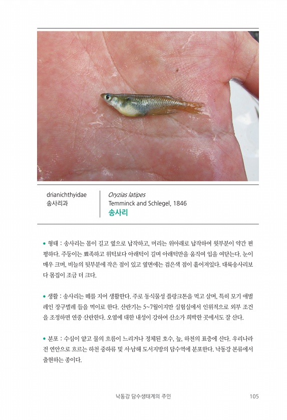 낙동강 담수생태계의 주인 105 ? 형태 송사리는 몸이 길고 옆으로 납작하고, 머리는 위아래로 납작하여 윗부분이 약간 편 평하다. 주둥이는 뾰족하고 위턱보다 아래턱이 길며 아래턱만을 움직여 입을 여닫는다. 눈이 매우 크며, 비늘의 뒷부분에 작은 점이 있고 옆면에는 검은색 점이 흩어져있다. 대륙송사리보 다 몸집이 조금 더 크다. ? 생활 송사리는 떼를 지어 생활한다. 주로 동식물성 플랑크톤을 먹고 살며, 특히 모기 애벌 레인 장구벌레 들을 먹이로 한다. 산란기는 57월이지만 실험실에서 인위적으로 외부 조건 을 조정하면 연중 산란한다. 오염에 대한 내성이 강하여 산소가 희박한 곳에서도 잘 산다. ? 분포 수심이 얕고 물의 흐름이 느리거나 정체된 호수, 늪, 하천의 표층에 산다. 우리나라 전 연안으로 흐르는 하천...