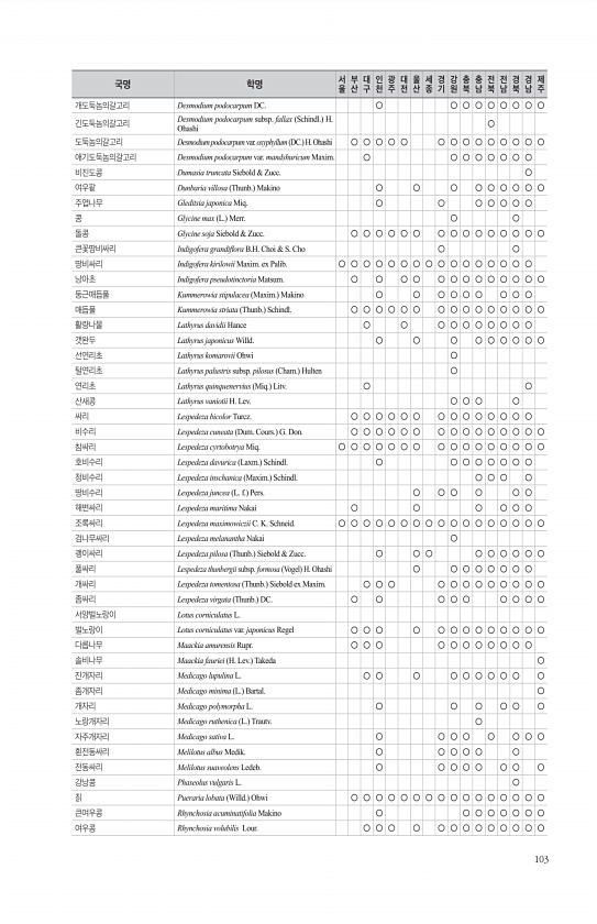 103 개도둑놈의갈고리 Desmodium podocarpum DC. ○ ○ ○ ○ ○ ○ ○ ○ ○ 긴도둑놈의갈고리 Desmodium podocarpum subsp. fallax Schindl. H. Ohashi ○ 도둑놈의갈고리 Desmodium podocarpum var. oxyphyllum DC. H. Ohashi ○ ○ ○ ○ ○ ○ ○ ○ ○ ○ ○ ○ ○ ○ 애기도둑놈의갈고리 Desmodium podocarpum var. mandshuricum Maxim. ○ ○ ○ ○ ○ ○ ○ ○ 비진도콩 Dumasia truncata Siebold & Zucc. ○ 여우팥 Dunbaria villosa Thunb. Makino ○ ○ ○ ○ ○ ○ ○ ○ ○ 주엽나무 Gleditsia japonica Miq...