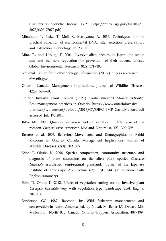87 Circulars on Zoonotic Disease. USGS. https//pubs.usgs.gov/fs/2017/ 3077/fs20173077.pdf Minamoto T, Naka T, Moji K, Maruyama A. 2016. Techniques for the practical collection of environmental DNAfilter selection, preservation, and extraction. Limnology 172332. Mito, T., and Uesugi, T. 2004. Invasive alien species in Japanthe status quo and the new regulation for prevention of their adverse effect...