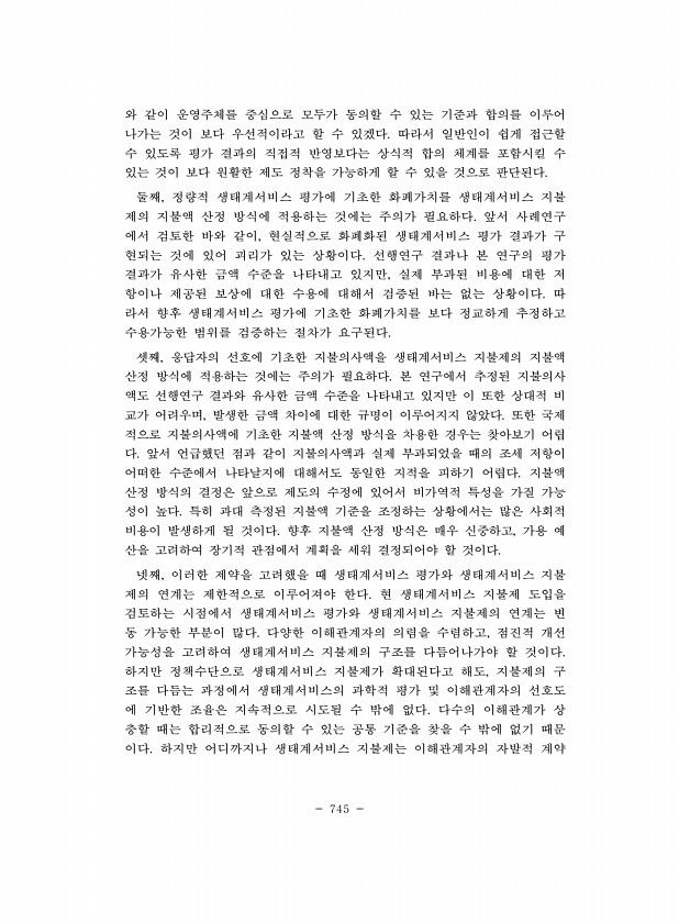 745 와 같이 운영주체를 중심으로 모두가 동의할 수 있는 기준과 합의를 이루어 나가는 것이 보다 우선적이라고 할 수 있겠다. 따라서 일반인이 쉽게 접근할 수 있도록 평가 결과의 직접적 반영보다는 상식적 합의 체계를 포함시킬 수 있는 것이 보다 원활한 제도 정착을 가능하게 할 수 있을 것으로 판단된다. 둘째, 정량적 생태계서비스 평가에 기초한 화폐가치를 생태계서비스 지불 제의 지불액 산정 방식에 적용하는 것에는 주의가 필요하다. 앞서 사례연구 에서 검토한 바와 같이, 현실적으로 화폐화된 생태계서비스 평가 결과가 구 현되는 것에 있어 괴리가 있는 상황이다. 선행연구 결과나 본 연구의 평가 결과가 유사한 금액 수준을 나타내고 있지만, 실제 부과된 비용에 대한 저 항이나 제공된 보상에 대한 수용에 대해서 검증된 ...