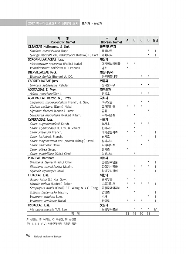 2017 백두대간보호지역 생태계 조사 묘적재 화방재 96 ? National Institute of Ecology 학 명 Scientific Name 국 명 Korean Name A B C D 등급 OLEACEAE Hoffmanns. & Link 물푸레나무과 Fraxinus mandshurica Rupr. 들메나무 * Ⅰ Syringa reticulata var. mandshurica Maxim. H. Hara 개회나무 * Ⅲ SCROPHULARIACEAE Juss. 현삼과 Melampyrum setaceum Palib. Nakai 애기며느리밥풀 * * Ⅱ Veronicastrum sibiricum L. Pennell 냉초 * Ⅱ DIERVILLACEAE Pyck 병꽃나무과 Weigela florida Bu...