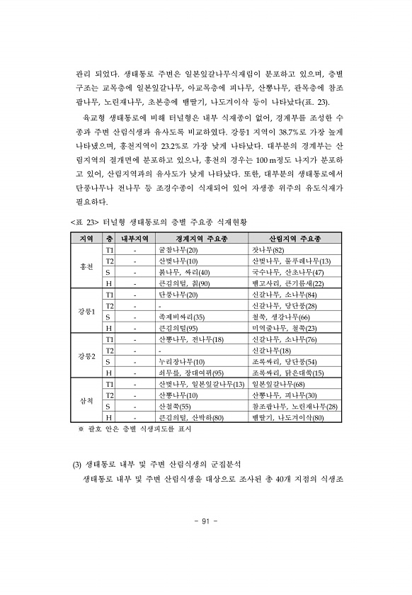 91 관리 되었다. 생태통로 주변은 일본잎갈나무식재림이 분포하고 있으며, 층별 구조는 교목층에 일본잎갈나무, 아교목층에 피나무, 산뽕나무, 관목층에 참조 팝나무, 노린재나무, 초본층에 뱀딸기, 나도겨이삭 등이 나타났다 표. 23 육교형 생태통로에 비해 터널형은 내부 식재종이 없어, 경계부를 조성한 수 종과 주변 산림식생과 유사도록 비교하였다. 강릉1 지역이 38.7%로 가장 높게 나타냈으며, 홍천지역이 23.2%로 가장 낮게 나타났다. 대부분의 경계부는 산 림지역의 절개면에 분포하고 있으나, 홍천의 경우는 100 m정도 나지가 분포하 고 있어, 산림지역과의 유사도가 낮게 나타났다. 또한, 대부분의 생태통로에서 단풍나무나 전나무 등 조경수종이 식재되어 있어 자생종 위주의 유도식재가 필요하다. 지역 층 내부지역...