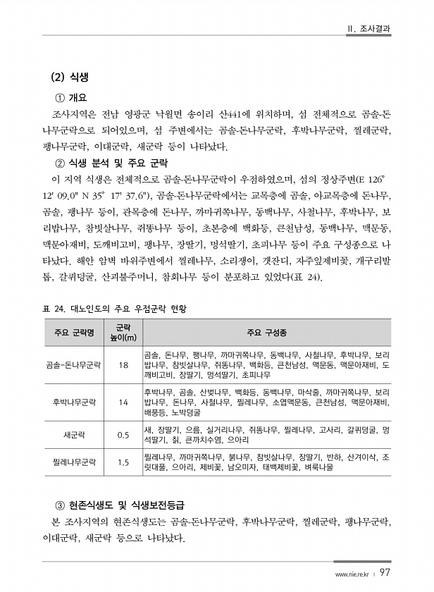 Ⅱ. 조사결과 www.nie.re.kr ? 97 2 식생 ① 개요 조사지역은 전남 영광군 낙월면 송이리 산441에 위치하며, 섬 전체적으로 곰솔-돈 나무군락으로 되어있으며, 섬 주변에서는 곰솔-돈나무군락, 후박나무군락, 찔레군락, 팽나무군락, 이대군락, 새군락 등이 나타났다. ② 식생 분석 및 주요 군락 이 지역 식생은 전체적으로 곰솔-돈나무군락이 우점하였으며, 섬의 정상주변 E 126。 1209.0N 35。1737.6, 곰솔-돈나무군락에서는 교목층에 곰솔, 아교목층에 돈나무, 곰솔, 팽나무 등이, 관목층에 돈나무, 까마귀쪽나무, 동백나무, 사철나무, 후박나무, 보 리밥나무, 참빗살나무, 쥐똥나무 등이, 초본층에 백화등, 큰천남성, 동백나무, 맥문동, 맥문아재비, 도깨비고비, 팽나무, 장딸기, 멍석딸기, 초...