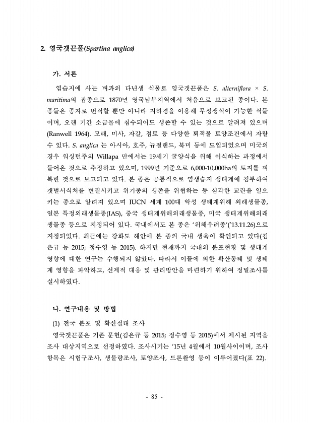 85 2. 영국갯끈풀 Spartina anglica 가. 서론 염습지에 사는 벼과의 다년생 식물로 영국갯끈풀은 S. alterniflora × S. maritima의 잡종으로 1870년 영국남부지역에서 처음으로 보고된 종이다. 본 종들은 종자로 번식할 뿐만 아니라 지하경을 이용해 무성생식이 가능한 식물 이며, 오랜 기간 소금물에 침수되어도 생존할 수 있는 것으로 알려져 있으며 Ranwell 1964 모래, 미사, 자갈, 점토 등 다양한 퇴적물 토양조건에서 자랄 수 있다. S. anglica 는 아시아, 호주, 뉴질랜드, 북미 등에 도입되었으며 미국의 경우 워싱턴주의 Willapa 만에서는 19세기 굴양식을 위해 이식하는 과정에서 들어온 것으로 추정하고 있으며, 1999년 기준으로 6,000-10,000ha의...