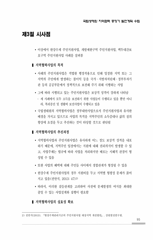 국립생태원 지역협력 중장기 발전계획 수립 95 제3절 시사점 ? 이상에서 한강수계 주민지원사업, 개발제한구역 주민지원사업, 백두대간보 호구역 주민지원사업 사례를 살펴봄 ? 지역협력사업의 목적 ? 사례의 주민지원사업은 적법한 행정작용으로 인해 일정한 지역 또는 그 지역의 주민에게 발생하는 불이익 등을 국가·지방자치단체·정부투자기 관 등의 공공부문에서 정책적으로 보전해 주기 위해 시행하는 사업 ? 그에 따라 시행되고 있는 주민지원사업은 보상적 성격이 강하게 나타남 세 사례에서 모두 소득을 보전하기 위한 사업들이 수행되고 있을 뿐만 아니 라, 복리증진 및 생활비 보전사업이 수행되고 있음 ? 국립생태원의 지역협력사업은 정부대안사업으로서 주민지원사업과 유사한 배경을 가지고 있으므로 사업의 목적을 지역주민의 소득증...