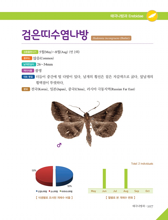 태극나방과?107 태극나방과 Erebidae 성충출현시기 5월 May 8월 Aug 연 2회 풍부도 많음 Common 날개편길이 2634mm 먹이식물 불명 대표 형질 더듬이 중간에 털 다발이 있다. 날개의 횡선은 짙은 자갈색으로 굵다. 앞날개의 횡맥점이 뚜렷하다. 분포 전국 Korea , 일본 Japan , 중국 China , 러시아 극동지역 Russian Far East 검은띠수염나방 Hadennia incongruens Butler 【 식생별로 조사된 개체수 비율 】 50% 신갈나무림 소나무림 아까시나무림 50% 【 월별로 본 개체수 변화 】 Total2 individuals May Jun Jul Aug SepOct