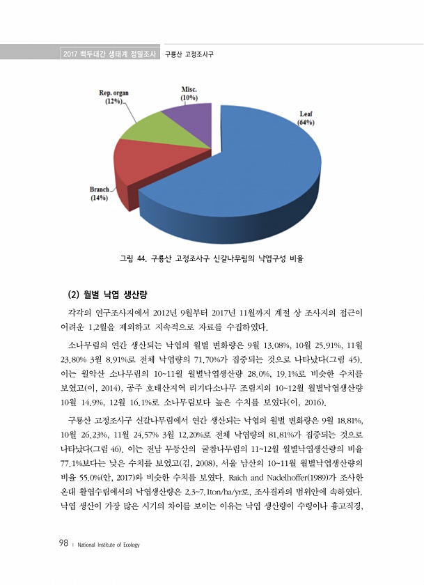 2017 백두대간 생태계 정밀조사 구룡산 고정조사구 98 ? National Institute of Ecology 그림 44. 구룡산 고정조사구 신갈나무림의 낙엽구성 비율 2 월별 낙엽 생산량 각각의 연구조사지에서 2012년 9월부터 2017년 11월까지 계절 상 조사지의 접근이 어려운 1,2월을 제외하고 지속적으로 자료를 수집하였다. 소나무림의 연간 생산되는 낙엽의 월별 변화량은 9월 13.08%, 10월 25.91%, 11월 23.80% 3월 8.91%로 전체 낙엽량의 71.70%가 집중되는 것으로 나타났다 그림 45 이는 월악산 소나무림의 1011월 월별낙엽생산량 28.0%, 19.1%로 비슷한 수치를 보였고 이, 2014 , 공주 호태산지역 리기다소나무 조림지의 1012월 월별낙엽생산량 10월 14....