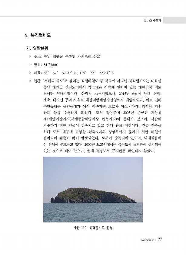 Ⅱ. 조사결과 www.nie.re.kr ? 97 4. 북격렬비도 가. 일반현황 ? 주소충남 태안군 근흥면 가의도리 산27 ? 면적31,736㎡ ? 좌표36° 37′ 32.09″N, 125° 33′ 33.84″E ? 현황‘서해의 독도’로 불리는 격렬비열도 중 북쪽에 자리한 북격렬비도는 내륙인 충남 태안군 신진도리에서 약 55km 서쪽에 떨어져 있는 대한민국 영토 최서단 영해기점이다. 산림청 소유지였으나, 2015년 6월에 등대 신축, 개축, 대수선 등의 사유로 대산지방해양수산청에서 매입하였다. 이로 인해 무인등대는 유인등대가 되어 어족자원 보호와 파고·파양, 최서단 기후 관측 등을 수행하게 되었다. 도서 정상부에 2005년 준공된 기상청 제1해양기상기지 서해종합해양기상 관측기지 와 등대가 있으며, 사람이 거주...