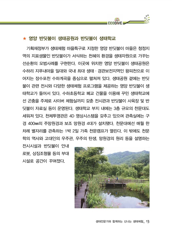생태전문가와 함께하는 신나는 생태체험_ 13 ★ 영양 반딧불이 생태공원과 반딧불이 생태학교 기획재정부가 생태체험 마을특구로 지정한 영양 반딧불이 마을은 청정지 역의 지표생물인 반딧불이가 서식하는 천혜의 환경을 생태자원으로 가꾸는 선순환의 모범사례를 구현한다. 이곳에 위치한 영양 반딧불이 생태공원은 수하리 지푸내마을 일대와 국내 최대 생태·경관보전지역인 왕피천으로 이 어지는 장수포천 수하계곡을 중심으로 펼쳐져 있다. 생태공원 곁에는 반딧 불이 관련 전시와 다양한 생태체험 프로그램을 제공하는 영양 반딧불이 생 태학교가 들어서 있다. 수하초등학교 폐교 건물을 이용해 꾸민 생태학교에 선 곤충을 주제로 사이버 체험실까지 갖춘 전시관과 반딧불이 사육장 및 반 딧불이 자료실 등이 운영된다. 생태학교 부지 내에는 3층 규...