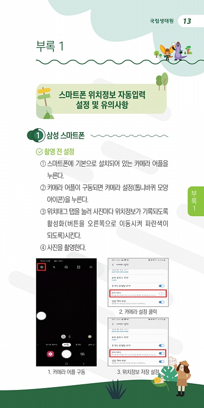 1 삼성 스마트폰 촬영 전 설정 ① 스마트폰에 기본으로 설치되어 있는 카메라 어플을 누른다. ② 카메라 어플이 구동되면 카메라 설정 톱니바퀴 모양 아이콘 을 누른다. ③ 위치태그 탭을 눌러 사진마다 위치정보가 기록되도록 활성화 버튼을 오른쪽으로 이동시켜 파란색이 되도록 시킨다. ④ 사진을 촬영한다. 스마트폰 위치정보 자동입력 설정 및 유의사항 부록 1 1. 카메라 어플 구동 3. 위치정보 저장 설정 2. 카메라 설정 클릭 13 부 록1