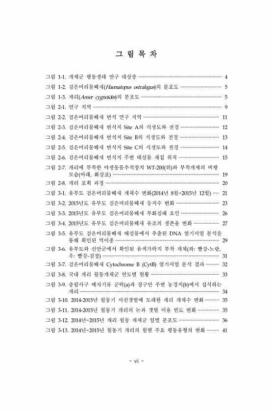 vii 그 림 목 차 그림 1-1. 개체군 행동생태 연구 대상종 ·································································· 4 그림 1-2. 검은머리물떼새 Haematopus ostralegus 의 분포도 ································ 5 그림 1-3. 개리 Anser cygnoides 의 분포도 ······························································· 5 그림 2-1. 연구 지역 ······································································································ ...