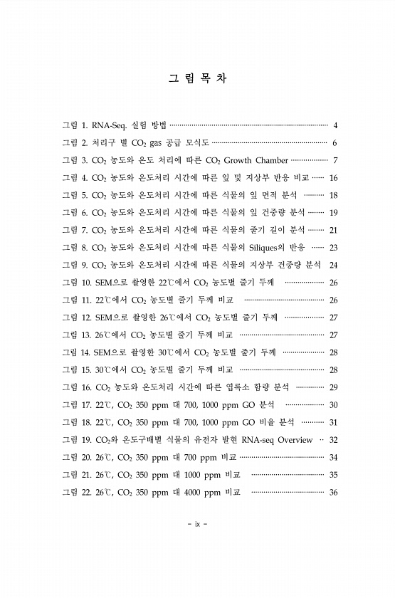 ix 그 림 목 차 그림 1. RNA-Seq. 실험 방법 ··············································································· 4 그림 2. 처리구 별 CO2 gas 공급 모식도 ·························································· 6 그림 3. CO2 농도와 온도 처리에 따른 CO2 Growth Chamber ·················· 7 그림 4. CO2 농도와 온도처리 시간에 따른 잎 및 지상부 반응 비교 ······ 16 그림 5. CO2 농도와 온도처리 시간에 따른 식물의 잎 면적 분석 ·········· 18 그림 6. CO2 농도와 온도처리 시간에 따른 식물의 잎 ...