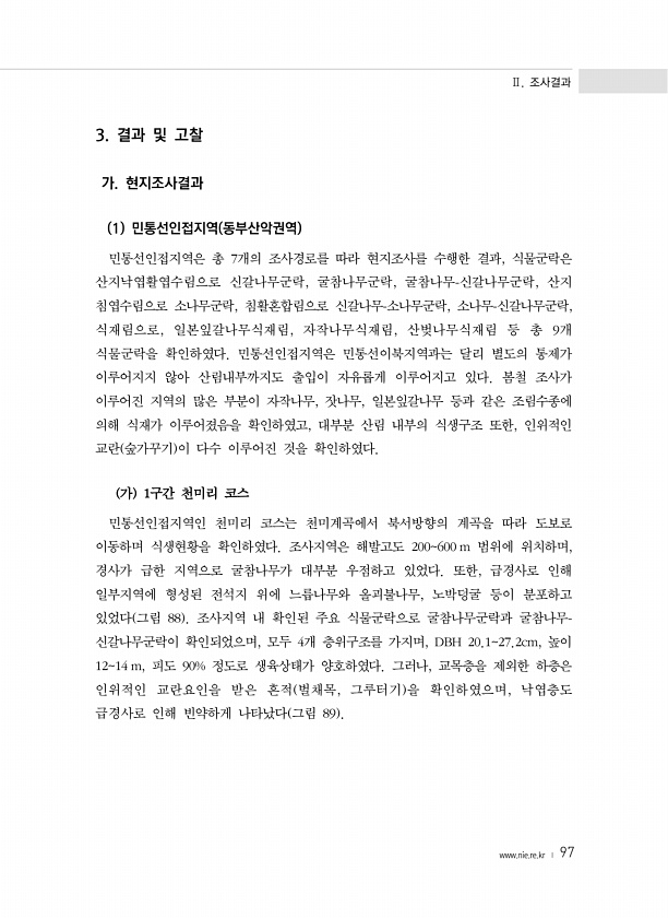Ⅱ. 조사결과 www.nie.re.kr ? 97 3. 결과 및 고찰 가. 현지조사결과 1 민통선인접지역 동부산악권역 민통선인접지역은 총 7개의 조사경로를 따라 현지조사를 수행한 결과, 식물군락은 산지낙엽활엽수림으로 신갈나무군락, 굴참나무군락, 굴참나무-신갈나무군락, 산지 침엽수림으로 소나무군락, 침활혼합림으로 신갈나무-소나무군락, 소나무-신갈나무군락, 식재림으로, 일본잎갈나무식재림, 자작나무식재림, 산벚나무식재림 등 총 9개 식물군락을 확인하였다. 민통선인접지역은 민통선이북지역과는 달리 별도의 통제가 이루어지지 않아 산림내부까지도 출입이 자유롭게 이루어지고 있다. 봄철 조사가 이루어진 지역의 많은 부분이 자작나무, 잣나무, 일본잎갈나무 등과 같은 조림수종에 의해 식재가 이루어졌음을 확인하였고, 대부분 산림 ...