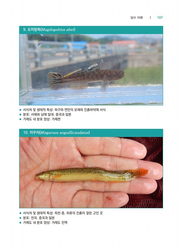 담수 어류 ┃ 107 ■ 서식처 및 생태적 특성하구와 연안의 모래와 진흙바닥에 서식 ■ 분포서해와 남해 일대. 중국과 일본 ■ 거제도 내 분포 양상거제면 ■ 서식처 및 생태적 특성하천 중, 하류의 진흙이 깔린 고인 곳 ■ 분포전국. 중국과 일본 ■ 거제도 내 분포 양상거제도 전역 9. 모치망둑 Mugilogobius abei 10. 미꾸리 Misgurnus anguillicaudatus