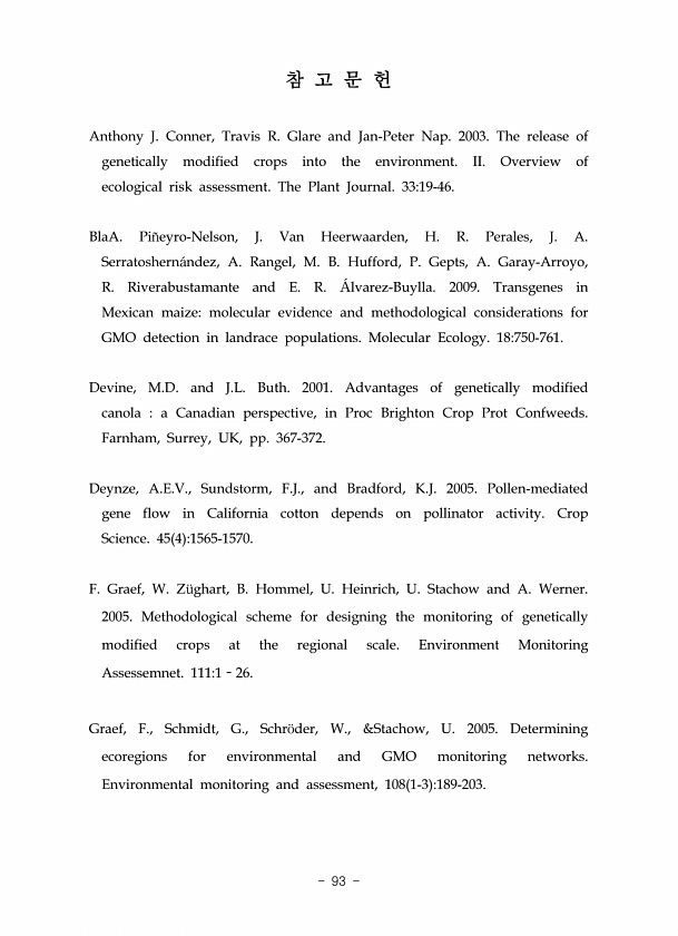 참 고 문 헌 Anthony J. Conner, Travis R. Glare and Jan-Peter Nap. 2003. The release of genetically modified crops into the environment. II. Overview of ecological risk assessment. The Plant Journal. 3319-46. BlaA. Pi?eyro-Nelson, J. Van Heerwaarden, H. R. Perales, J. A. Serratoshern?ndez, A. Rangel, M. B. Hufford, P. Gepts, A. Garay-Arroyo, R. Riverabustamante and E. R. ?lvarez-Buylla. 2009. Transgene...