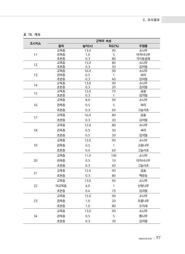 Ⅱ. 조사결과 www.nie.re.kr ? 97 조사지소 군락의 속성 층위 높이 m 피도 % 우점종 11 교목층 13.0 90 소나무 관목층 1.0 5 아까시나무 초본층 0.3 80 각시둥글레 12 교목층 15.0 80 소나무 초본층 0.3 50 김의털 13 교목층 16.0 90 소나무 관목층 0.5 1 싸리 초본층 0.3 40 김의털 14 교목층 13.0 90 소나무 초본층 0.3 20 김의털 15 교목층 12.0 70 곰솔 초본층 0.3 1 김의털 16 교목층 8.0 90 소나무 관목층 0.5 5 싸리 초본층 0.3 60 그늘사초 17 교목층 16.0 80 곰솔 초본층 0.3 20 김의털 18 교목층 12.0 80 소나무 관목층 0.5 50 싸리 초본층 0.5 50 김의털 19 교목층 12.0 90 소나...