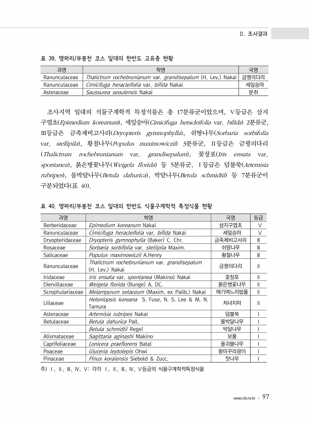 Ⅱ. 조사결과 www.nie.re.kr ? 97 과명 학명 국명 Ranunculaceae Thalictrum rochebrunianum var. grandisepalum H. Lev. Nakai 금꿩의다리 Ranunculaceae Cimicifuga heracleifolia var. bifida Nakai 세잎승마 Asteraceae Saussurea seoulensis Nakai 분취 표 39. 명파리/부봉천 코스 일대의 한반도 고유종 현황 조사지역 일대의 식물구계학적 특정식물은 총 17분류군이었으며, Ⅴ등급은 삼지 구엽초 Epimedium koreanum , 세잎승마 Cimicifuga heracleifolia var. bifida 2분류군, Ⅲ등급은 금족제비고사리 Dryopteris gymnophyll...