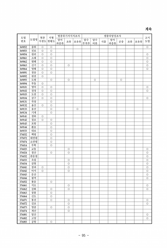 95 도엽 번호 도엽명 식생도 현존 현황도 지형 양서 멸종위기서식지조사 생물다양성조사 고시 도엽 파충류 조류 포유류 무척추 담수 담수 어류 식물 파충류 양서 곤충 조류 포유류 369052 송하 ○ ○ ○ 369053 진보 ○ ○ 369054 원리 ○ ○ ○ 369061 소태 ○ ○ ○ 369062 평해 ○ ○ ○ 369063 신기 ○ ○ ○ ○ 369064 영해 ○ ○ ○ 369091 청송 ○ ○ 369092 원전 ○ 369093 도평 ○ ○ ○ ○ 369094 부동 ○ 369101 영덕 ○ ○ ○ 369102 경정 ○ ○ ○ 369103 도천 ○ ○ 369104 강구 ○ ○ ○ 369131 죽장 ○ 369132 율산 ○ ○ 369133 용산 ○ ○ 369134 기계 ○ 369141 청하 ○ 369142 칠...