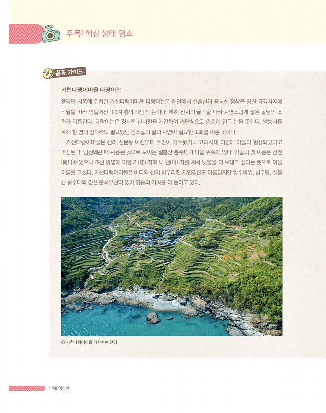 남해 앵강만 가천다랭이마을 다랑이논 앵강만 서쪽에 위치한 가천다랭이마을 다랑이논은 해안에서 설흘산과 응봉산 정상을 향한 급경사지에 비탈을 따라 만들어진 100여 층의 계단식 논이다. 특히 산지의 굴곡을 따라 자연스럽게 쌓은 돌담의 조 화가 아름답다. 다랑이논은 경사진 산비탈을 개간하여 계단식으로 층층이 만든 논을 뜻한다. 쌀농사를 위해 한 뼘의 땅이라도 필요했던 선조들의 삶과 자연이 절묘한 조화를 이룬 곳이다. 가천다랭이마을은 신라 신문왕 이전부터 주민이 거주했거나 고려시대 이전에 마을이 형성되었다고 추정된다. 임진왜란 때 사용된 것으로 보이는 설흘산 봉수대가 마을 위쪽에 있다. 마을의 옛 이름은 간천 間川 이었으나 조선 중엽에 더할 가 加 자에 내 천 川 자를 써서 냇물을 더 보태고 싶다는 뜻으로 마을 이...