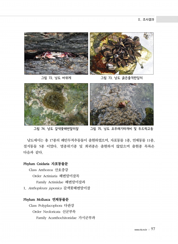 Ⅱ. 조사결과 www.nie.re.kr ? 97 그림 72. 낭도 바위게 그림 73. 낭도 굵은줄격판담치 그림 74. 낭도 갈색꽃해변말미잘 그림 75. 낭도 조무래기따개비 및 두드럭고둥 낭도에서는 총 17종의 해안무척추동물이 출현하였으며, 자포동물 1종, 연체동물 11종, 절지동물 5종 이었다. 멸종위기종 및 희귀종은 출현하지 않았으며 출현종 목록은 다음과 같다. Phylum Cnidaria 자포동물문 Class Anthozoa 산호충강 Order Actiniaria 해변말미잘목 Family Actiniidae 해변말미잘과 1. Anthopleura japonica 갈색꽃해변말미잘 Phylum Mollusca 연체동물문 Class Polyplacophora 다판강 Order Neoloricata 신군부목 F...
