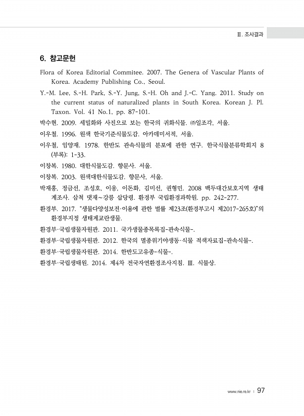 Ⅱ. 조사결과 www.nie.re.kr ? 97 6. 참고문헌 Flora of Korea Editorial Commitee. 2007. The Genera of Vascular Plants of Korea. Academy Publishing Co., Seoul. Y.-M. Lee, S.-H. Park, S.-Y. Jung, S.-H. Oh and J.-C. Yang. 2011. Study on the current status of naturalized plants in South Korea. Korean J. Pl. Taxon. Vol. 41 No.1, pp. 87-101. 박수현. 2009. 세밀화와 사진으로 보는 한국의 귀화식물. ㈜일조각, 서울. 이우철. 1996. 원색 한국기준식물도감. 아카데미서적...