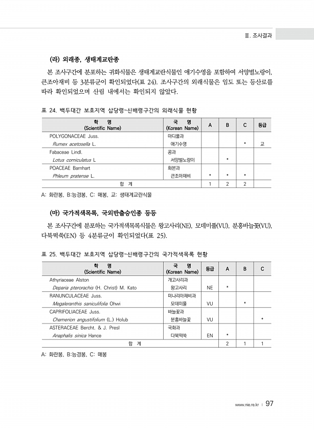 Ⅱ. 조사결과 www.nie.re.kr ? 97 라 외래종, 생태계교란종 본 조사구간에 분포하는 귀화식물은 생태계교란식물인 애기수영을 포함하여 서양벌노랑이, 큰조아재비 등 3분류군이 확인되었다 표 24 조사구간의 외래식물은 임도 또는 등산로를 따라 확인되었으며 산림 내에서는 확인되지 않았다. 표 24. 백두대간 보호지역 삽당령신배령구간의 외래식물 현황 학 명 Scientific Name 국 명 Korean Name A B C 등급 POLYGONACEAE Juss. 마디풀과 Rumex acetosella L. 애기수영 * 교 Fabaceae Lindl. 콩과 Lotus corniculatus L 서양벌노랑이 * POACEAE Barnhart 화본과 Phleum pratense L. 큰조아재비 * * * 합 계...