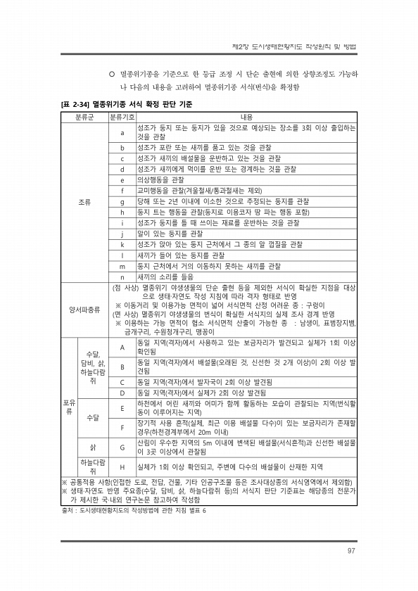 제2장 도시생태현황지도 작성원칙 및 방법 97 ¡ 멸종위기종을 기준으로 한 등급 조정 시 단순 출현에 의한 상향조정도 가능하 나 다음의 내용을 고려하여 멸종위기종 서식 번식 을 확정함 분류군 분류기호 내용 조류 a 성조가 둥지 또는 둥지가 있을 것으로 예상되는 장소를 3회 이상 출입하는 것을 관찰 b 성조가 포란 또는 새끼를 품고 있는 것을 관찰 c 성조가 새끼의 배설물을 운반하고 있는 것을 관찰 d 성조가 새끼에게 먹이를 운반 또는 경계하는 것을 관찰 e 의상행동을 관찰 f 교미행동을 관찰 겨울철새/통과철새는 제외 g 당해 또는 2년 이내에 이소한 것으로 추정되는 둥지를 관찰 h 둥지 트는 행동을 관찰 둥지로 이용코자 땅 파는 행동 포함 i 성조가 둥지를 틀 때 쓰이는 재료를 운반하는 것을 관찰 j 알이 ...
